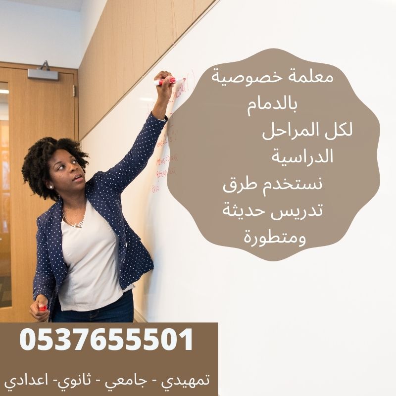 دروس خصوصية بالدمام ليست بالحفظ بل عن طريق الفهم الكامل والوعي لها. لدينا خبرة اكثر من 15 عام في تبسيط المعلومات وشرحها بالاسلوب المناسب لكل طالب. نوفر عمل مراجعات دورية. نوفر الاجواء التي تساعد علي التطور والمذاكرة وحب الاستذكار. نقوم بالتدريس للمراحل التدريبية والتعليمة المختلفة. لدينا معلمات حاصلات علي درجات علمية كبيرة ومختلفة. نقوم بتدريس كافة المواد. نقوم بتزويد الطلاب باعلي المهارات. نساعد الطلاب في التغلب علي صعوبات التعلم.