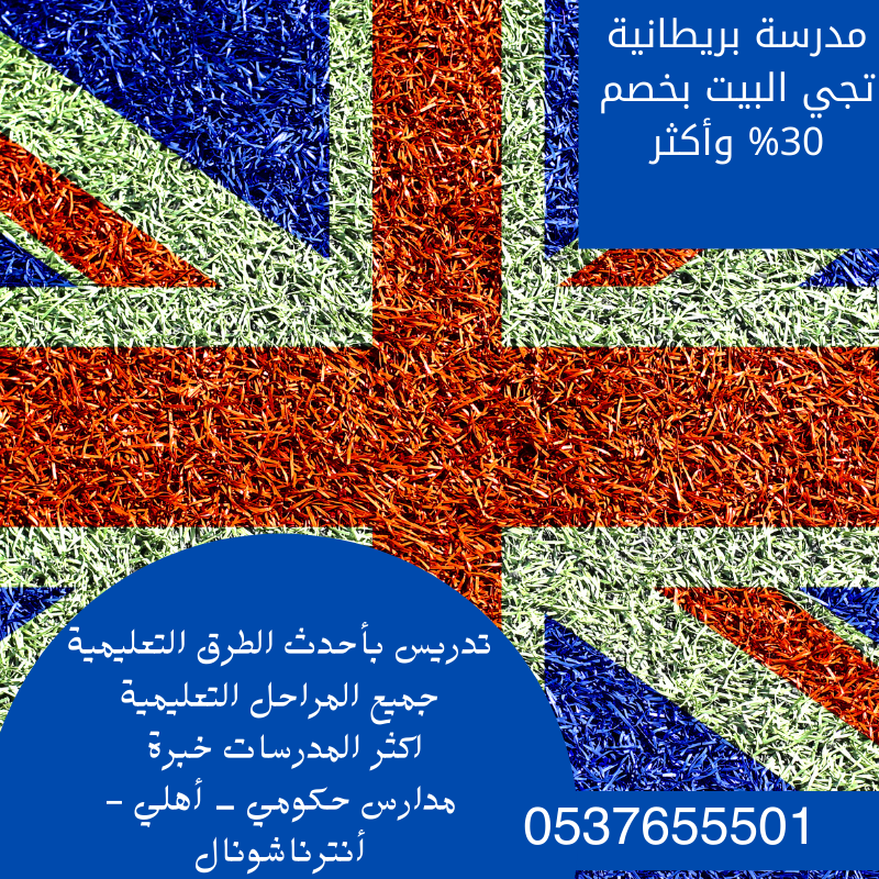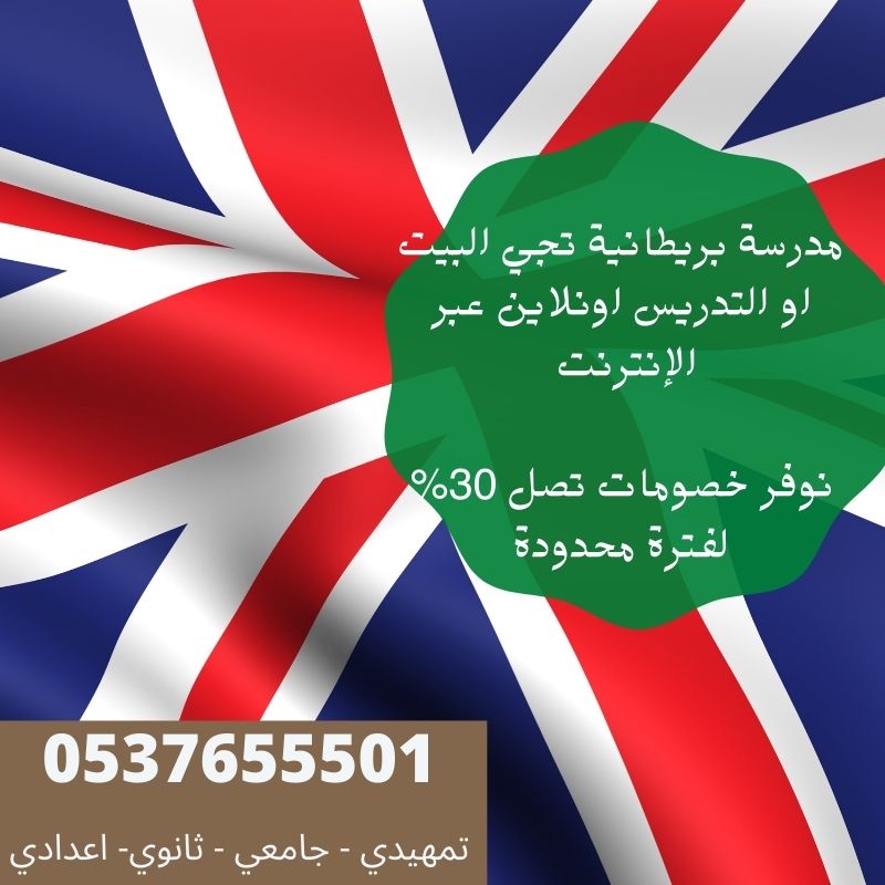 نوفر لك أفضل مدرسة بريطانية تجي البيت في جميع أحياء الرياض وجميع مدن المملكة , تمتلك خبرة تعليمية ودراسية لا تقل عن 20 عاما , لشرح وتدريس اللغة الانجليزية باللهجة البريطانية الاصلية لجميع المستويات , بكفاءة عالية ,واقل الأسعار التي في متناول أيدي الجميع ,وخصومات هائلة تصل إلى 30% , وخصم خاص للإخوان في نفس البيت, يتوفر لدينا أيضا التدريس اونلاين .