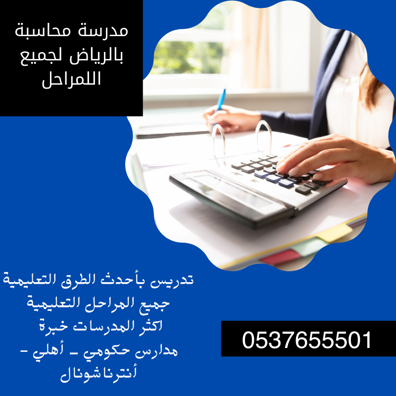 مدرسة محاسبة بالرياض من أفضل واكفأ مدرسات المملكة ,تجي البيت على حسب موقعكم مع اتخاذ كافة الإجراءات الوقائية,إمكانية التدريس اونلاين, لشرح وتدريس مادة المحاسبة بجميع اقسامها بكفاءة عالية (مبادئ محاسبة -محاسبة تكاليف-محاسبة إدارية-محاسبة مالية -محاسبة عامة ) باستخدام أفضل الطرق المبتكرة والمعتمدة في الشرح والتدريس والتي يسهل فهمها, قدرة عالية على تلخيص المناهج بطرق احترافية , عمل ابحاث , عمل مذكرات قوية في المادة , اختبارات تجريبية لقياس مدى فهم الطالب للمادة , متابعات يومية , مراجعات بشكل مستمر للدروس, مراجعات نهائية قبل امتحانات العام الدراسي.
